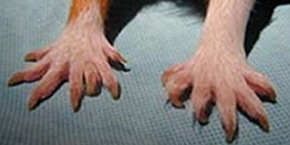 Nohy: srst na nožkách má jen k patnímu kloubu. Obličej si čistí vnitřní hranou ťapky - ne celou dlaní. Stojí na celých chodidlech, ale chodí a běhá jen po prstech, proto umí běžet velice rychle. Ťapičky nepoužívá ( jako většina hlodavců ) k držení potravy, zřídka použije jednu ťapku na přidržení nějaké dobroty.