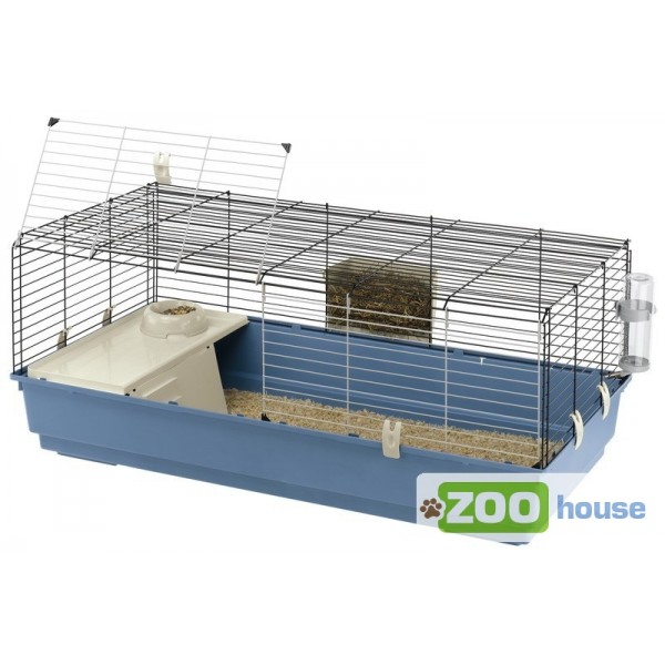 Vpravo je ještě závěsné pítko. Další možnost pití je v misce s vodou, která je na zemi - u okraje blíže sem. Holčiny nejraděj skáčou z podlahy na dřevěný domek - do fialového pelíšku, pak na střechu jesliček - pak na seníkový bunkr - pak na plastové mini-patro s vlněným pelíškem. Tam je i miska s granulkama a sušenýma dobrotama + závěsné pítko. Holky pak zase skočí na zem bydleníka - vlítnou pod mini-patro - pak zas vyletí z pod stříšky ven a vše dokola proběhnou znova.... buď přímo, nebo prolítnou seníkovým bunkrem, který má ze všech stran otvory. Pěkně se tu morčíci vyblbnou.